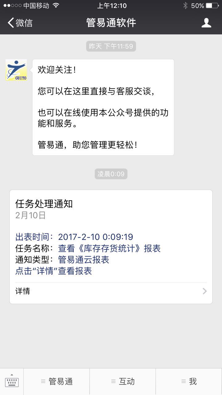 点击这里在线咨询 《管易通云报表升级版》也称为“微信云报表”,即可以在微信上方便的接收、查看管易通软件输出的报表。