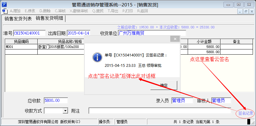 在电脑上的单据界面,右下角,有“云签名记录”几个字。